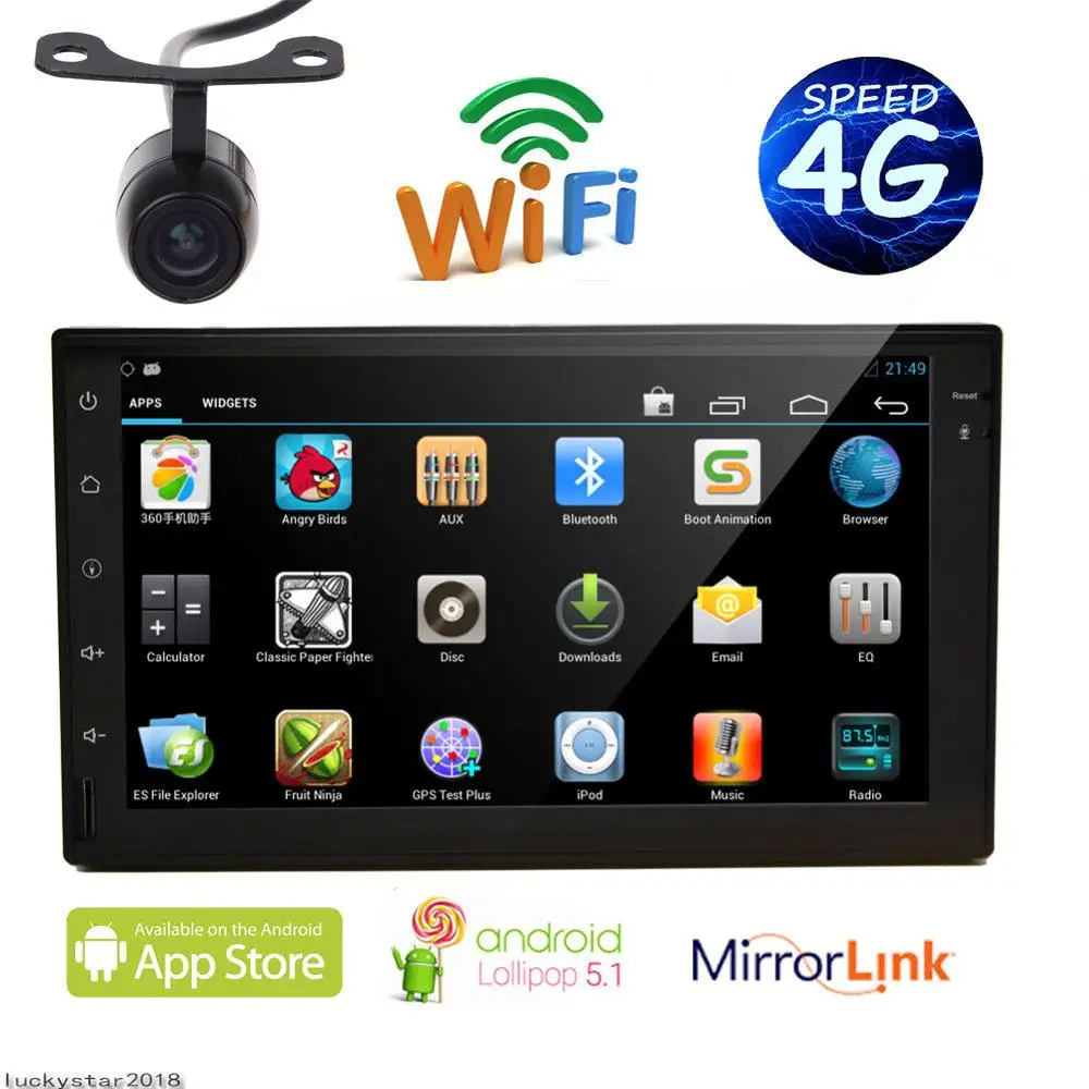 2DIN In Dash GPS Car Stereo Android5.1 Bluetooth Radio Quad-core WIFI 4G Aux+Cam Buyer Guidance Android 5.1.1 Lollipop OS, support most android applications. CPU: Quad Core 1.6GHz*4, 1GB RAM, 16GB ROM Multi points capacitive touch screen, 800*480resolution, make character much clearer User-defined key light colors and animated wallpaper to follow your style Support 9 EQ for music and video 4 x 45W surround stereo, subwoofer output Easy to connect WiFi, built-in wifi modem Support 3g/4g hotspot sharing, need extra 3G/4G Dongle Support series of GPS software and network map, more GPS settings are depended on the software program Be able to install most apps: Tomtom Navigation,Waze, iGO, Google Maps,Here,Spotify, Pandora, Play Music, & more. Internet function can make GPS map automatically achieve time synchronization Bluetooth for hands-free calls, phonebook, Streaming music, support OBD2(need extra Bluetooth OBD2 scanner) Support Mirror-Link to achieve audio, video and picture in the phone synchronized playing. Most of android phones and iPhones are allowed. Built-in microphone. AM/FM radio, support saving 30 stations and RDS function 1080P video decoder, support many video formats: VP8,H264, VC1, RMVB,etc Videos playable via Phone, SD card, USB flash drive and other online videos, DVD drive not included. Video Out: Couldn't support the resources from SD card, USB flash drive and other online videos, etc. Automatic backlight dimming in the night makes night driving safer and reduce visual fatigue USB Output Voltage and Current: 5V/500mA Support USB/SD card up to 32G(not included) Support rear camera input 2 Din size:178mm* 100mm Operating temperature: -20~70 FREE GIFT:REVERSE CAMERA Latest Android 5.1 Lollipop Operation System :Stable & Smooth 4*1.6 GHz Quad-core Cortex A9 Processor + 1 GB RAM + 16 GB ROM 7" HD Capacitive Full-Touch Screen : Accurate , Sensitive , Durable , Anti-friction Double 2 Din In Dash Car Stereo GPS Navigation System with Built-in GPS Maps HD Multimedia Player Support 1080P HD Video , MP3/MP4/MP5/RMVB/AVI...etc Built-in FM/AM Auto-scan Radio , Support RDS Up to 30 Preset Channel Built-in Wifi Module , Support 3G/4G Network for Intrernet & Google Online Maps Support Mirror Link - Do Anything Your Smart Phone Can On The Stereo Bluetooth - OSD Language - Multi-color Key Backlight Options - Wallpaper - Car Logo Support Steering Wheel Control + Remote Control + USB/SD/Aux-in + Rear Camera Input Optional Configuration : DVR / OBD2 / Digital TV / 3G or 4G Dongle ( Need Pay Extra )